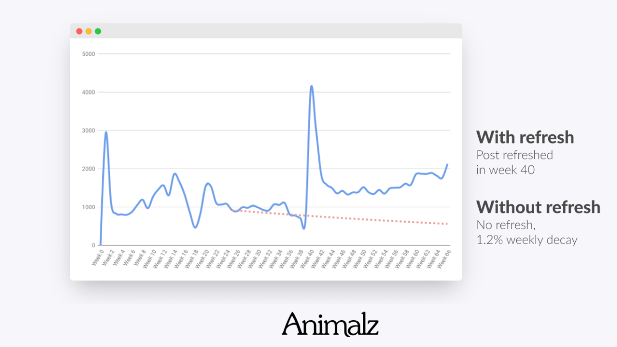 Refreshing content decreases decay, which makes it far easier to grow total traffic. In the same way that a business requires acquisition to grow, it’s still easier and more profitable to expand, up-sell, and cross-sell existing customers. You need both.