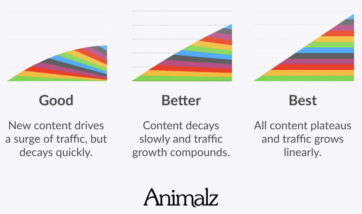 It’s easy to see the value of content refreshes on a post-by-post level, but the importance is even more clear when we examine an entire site. The average B2B SaaS blog is constantly losing traffic to older posts and gaining traffic from newer posts. This trend cycles—soon, the new content becomes old and starts to decay. New content is created to ward off the decline of the blog as a whole. This cycle—a very expensive and inefficient one—repeats in perpetuity.If you could X-ray your Google Analytics, you’d see layers of content. Some would be trending up, while others trend down. Cumulative traffic is growing, but is slowed significantly by the decay of older content. The “best” scenario is nearly impossible to achieve in practice, but it’s what we all should aim for.