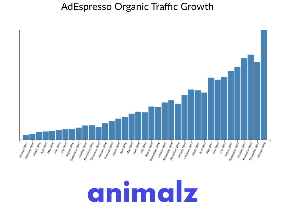 In order to scale traffic, you have to let go of the traffic dopamine hit. Steady growth is unsexy. AdEspresso,one of the most successful content operations we've come across, grew organic traffic 9.79% per month for three years. That propelled the site from 84,000 pageviews in January 2015 to more than 10x that three years later.