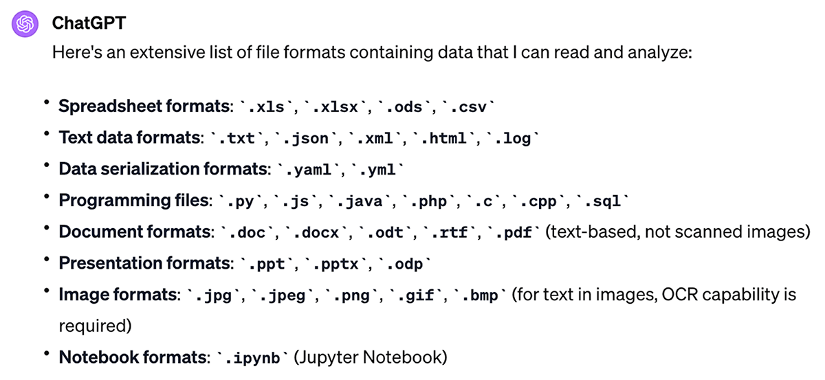 When this article was still an outline, analyzing lots of data with ChatGPT was challenging. You needed a plugin or developer who understands Python or JSON. But as this outline became a draft, OpenAI released a ChatGPT update that dazzles with the file formats it can handle.