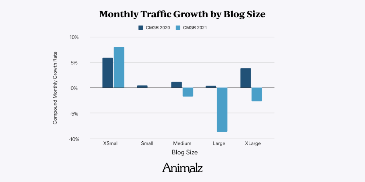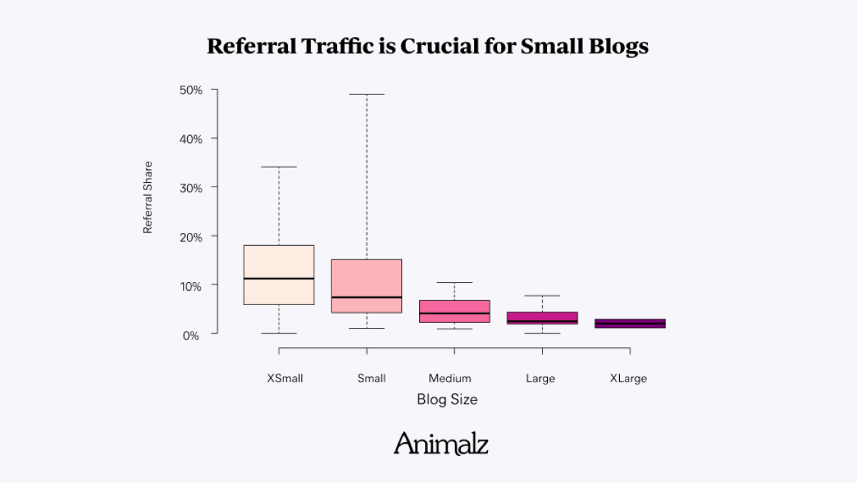The smallest blogs in our dataset saw almost 12% of their total blog traffic come from Referral traffic—that is, visitors clicking-through backlinks to their content.