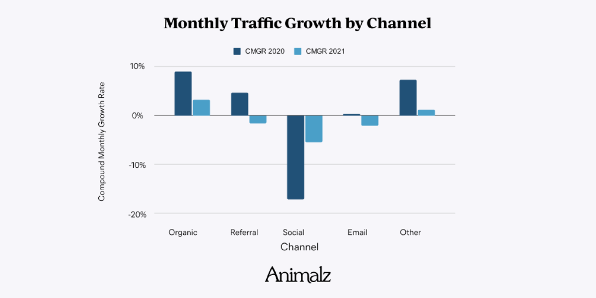 All other main traffic sources—referral, social, and email—shrunk over the course of the year. This is in stark contrast to 2020, when only social traffic declined: