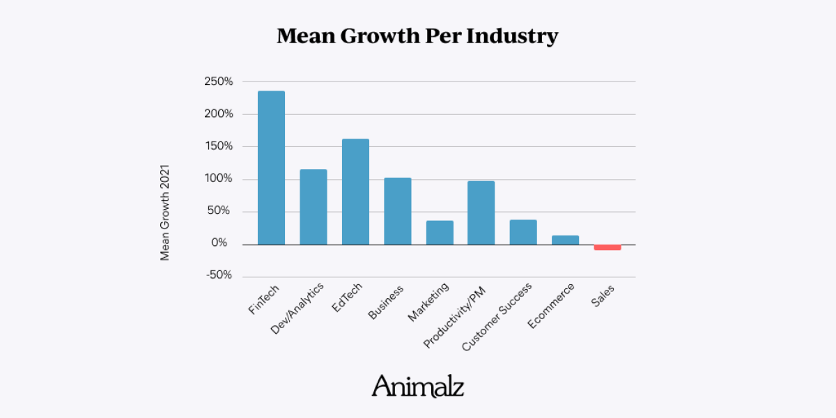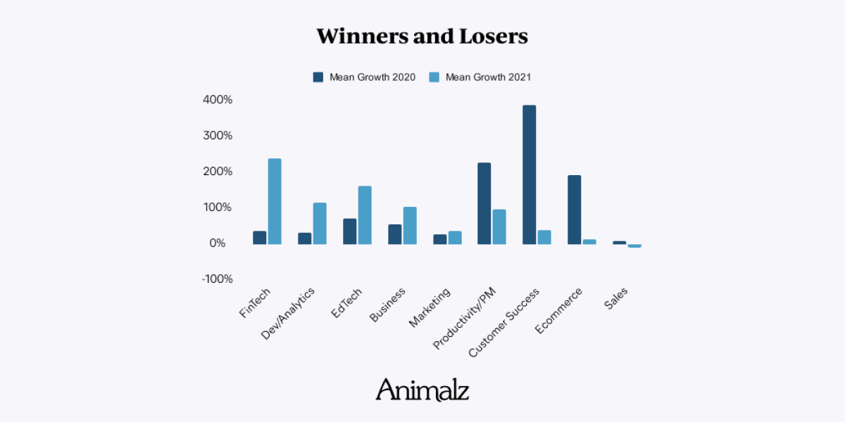 Mean Growth 2020 Mean Growth 2021 Change in Growth Fintech 36.12% 236.14% 553.77% Dev/Analytics 31.12% 115.75% 271.95% EdTech 71.30% 161.75% 126.86% Business 55.38% 103.28% 86.49% Marketing 27.40% 37.62% 37.30% Productivity/Project Management 226.13% 97.53% -56.87% Customer Success/Support 383.29% 38.62% -89.92% Ecommerce 189.95% 14.11% -92.57% Sales 9.89% -8.10% -181.90%