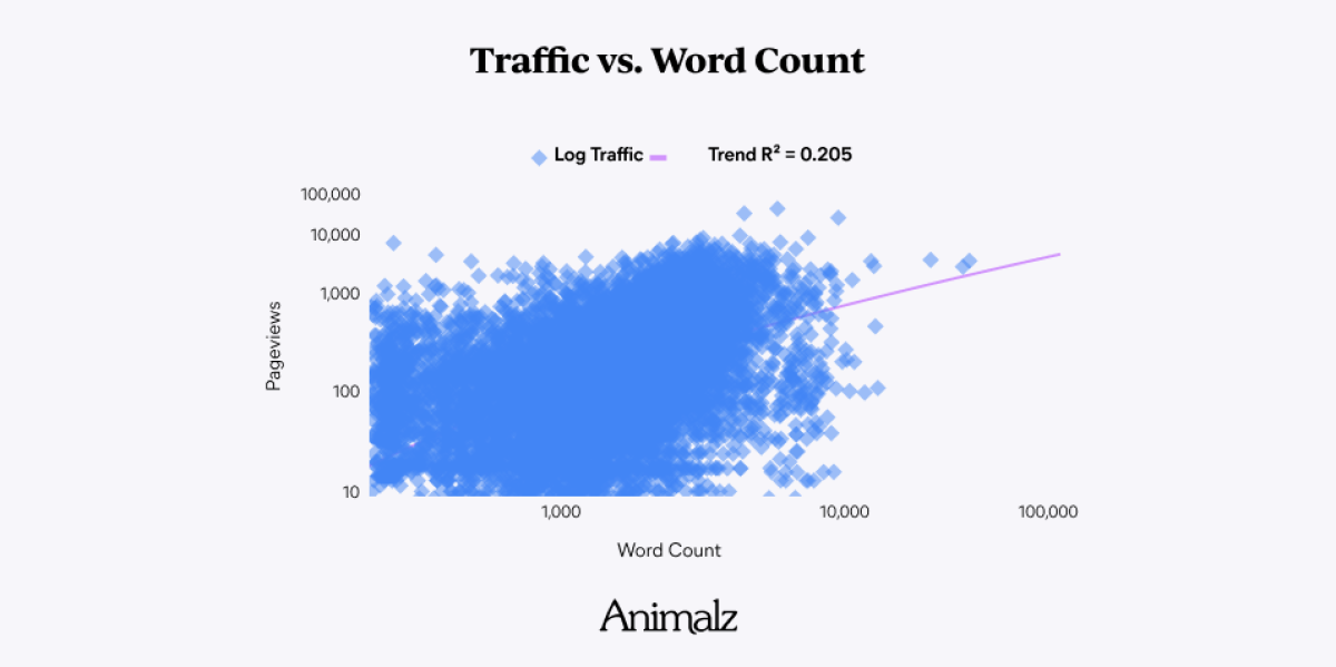 When we correlate each of these article word counts with their traffic over the past year, we can see a positive trend between word count and traffic: