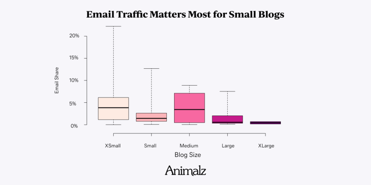 Animalz is a prime example of the power of email. We are part of the ‘small’ category in this dataset but generate 12.69% of our traffic from email (the very top-end of the box plot). Our newsletter helps us talk directly to our target audience and direct them to the best content on our site. More often than not, a newsletter is the impetus for a new lead reaching out.
