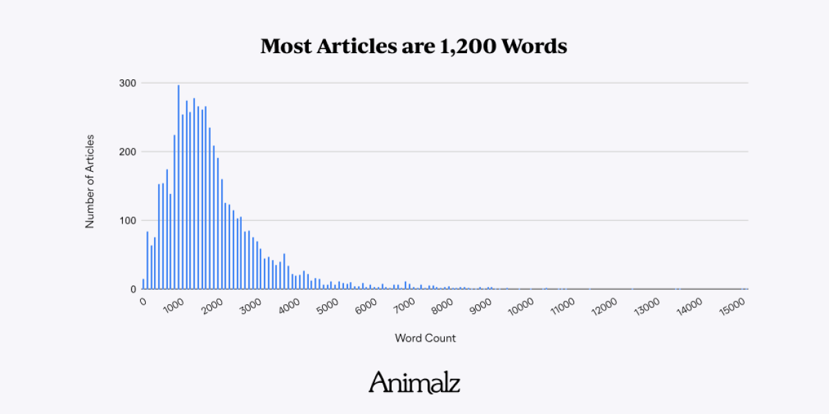 Our data suggest that this observation is right. We took a subset of our dataset—15,000 articles—and looked at how they performed. Within this dataset, the median article length was 1,200 words, though there was a massive long tail: