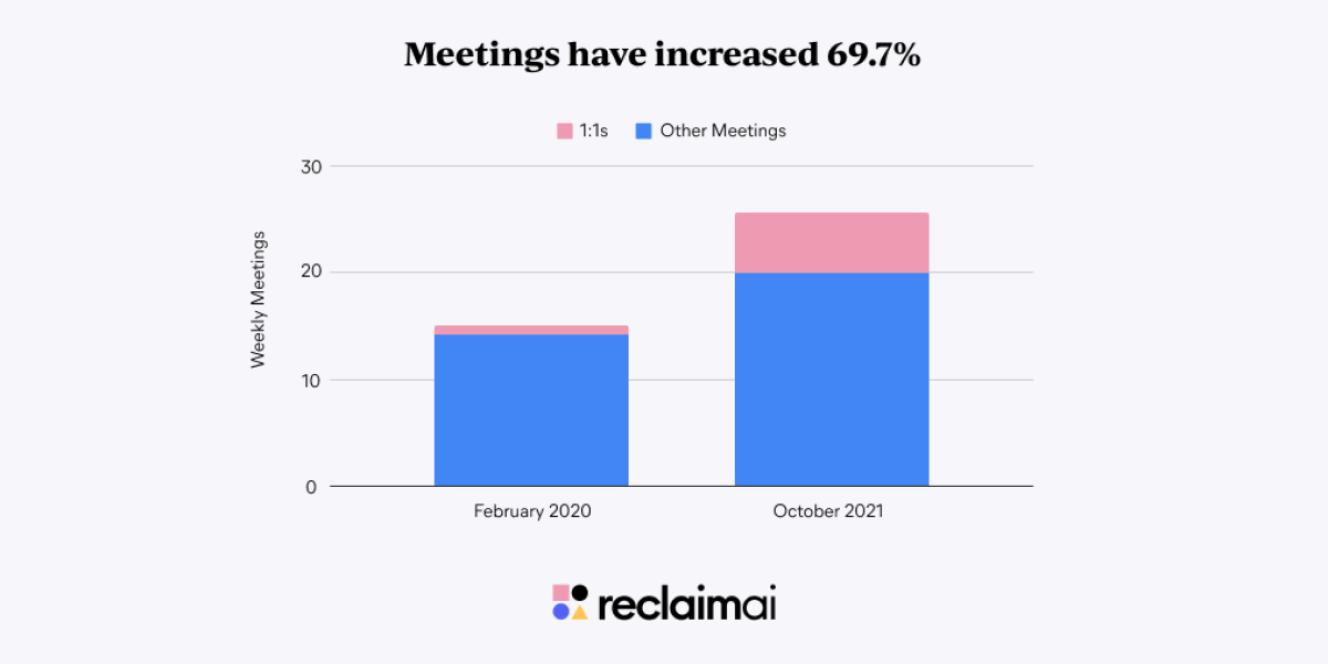 The end result is staggering: Professionals average 21.5 hours in meetings a week, over half of the “standard 40-hour workweek”. In the past year, we spent 7.3 hours more in meetings per week than 2020…without adjustments elsewhere to compensate.