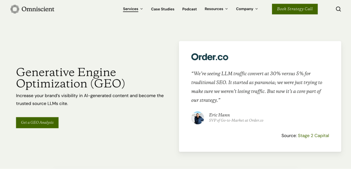 Omniscient Digital is an organic growth agency. They've integrated GEO into their core offering, focusing specifically on brands where technical complexity meets long sales cycles.
