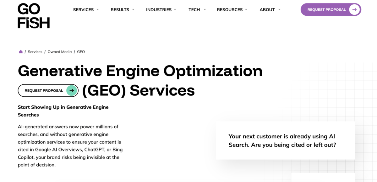 Go Fish Digital is a performance marketing agency offering services from content marketing to social commerce. They offer AEO backed by strong SEO fundamentals to help brands show up in AI-powered search.