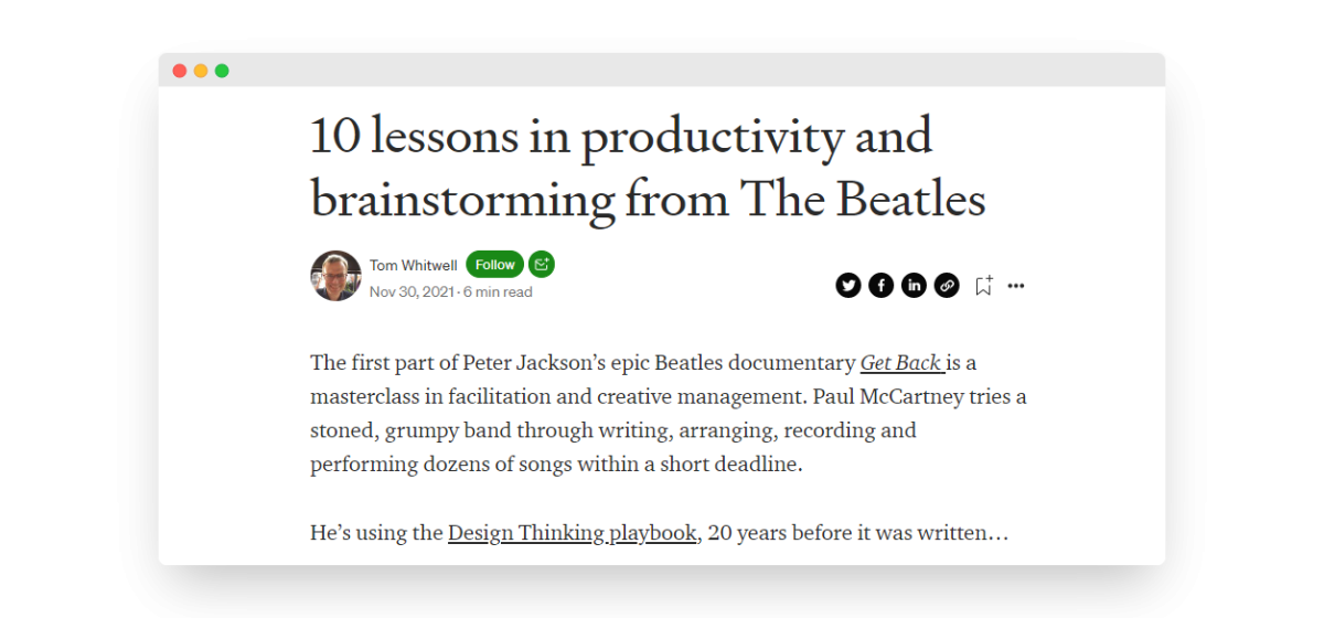 This article turns an hours-long documentary about the Beatles’ creative process into a five-minute blog post. This article from CB Insights summarizes the contents of dozens of company memos.