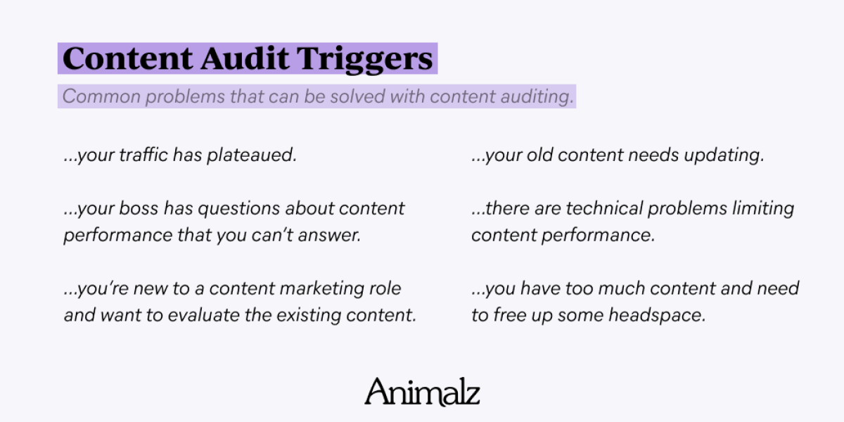 Content audits are most valuable when a company has consistently published content (that is, on a weekly or greater cadence) for over a year. At this stage, most blogs have enough content to become unwieldy and harder to analyze, and you run into one or more of the following problems.
