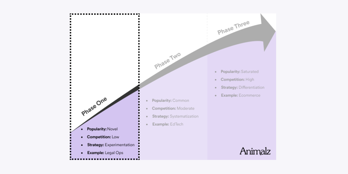 In phase three, differentiation wins. With the best keyword opportunities contested by big, established companies, and with every company following the same “best practices” playbook, companies need to differentiate themselves from the masses of existing content or else be lost in the noise. In practice, that means using tactics like: