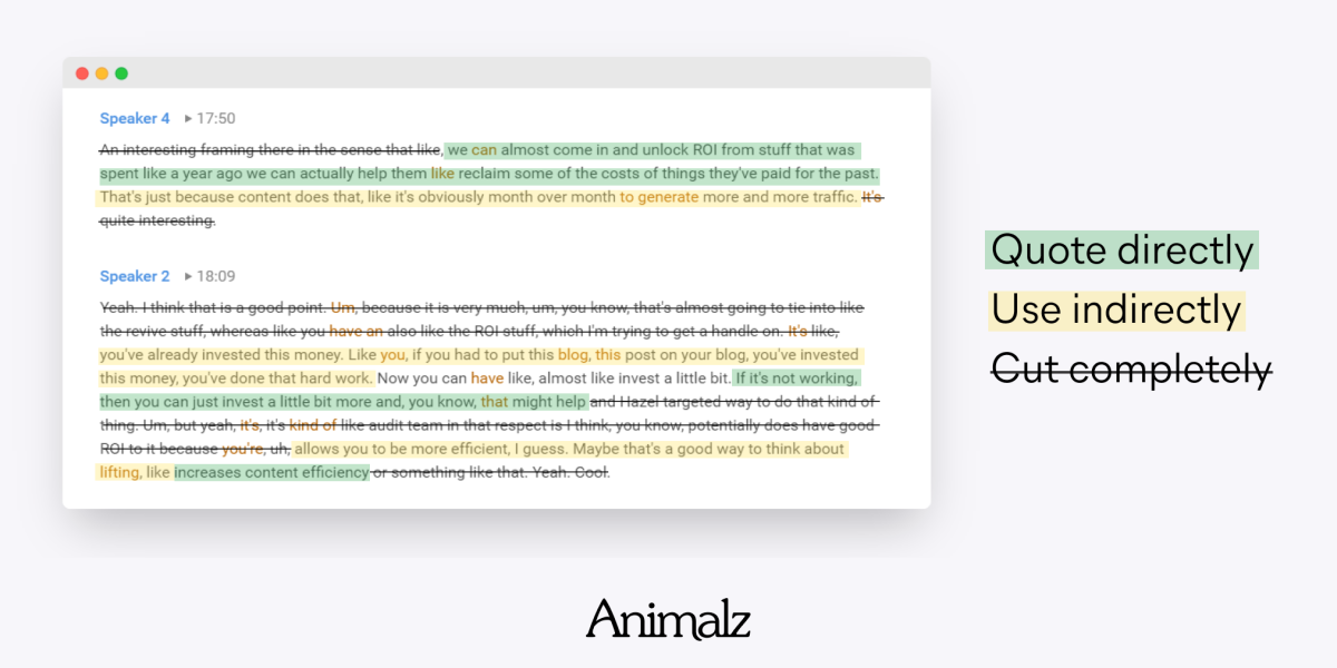 Call out specific language to use as pull quotes. Some parts of your interview will be useful for structuring the general narrative—you’ll paraphrase them and work their contents into your writing indirectly. Others are useful to use as direct quotes, using the SME’s exact language as a catchy quote or illustrative example.