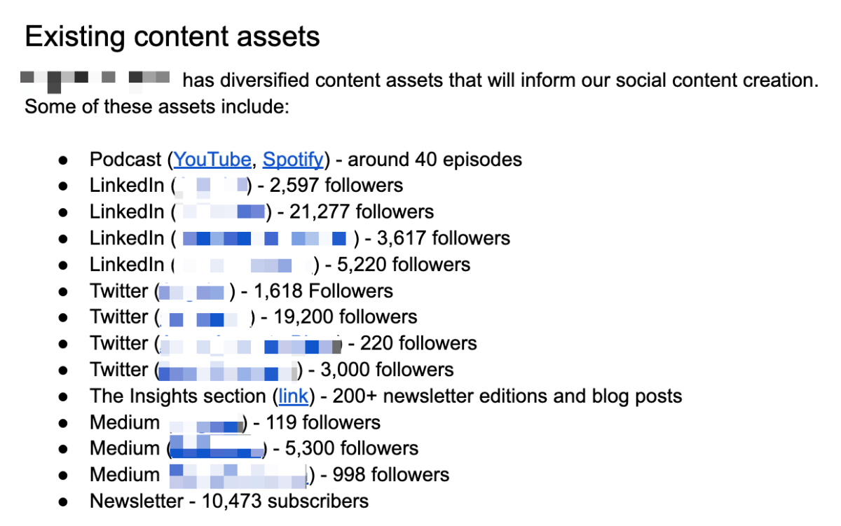 List your channels(e.g., organic, LinkedIn, YouTube, TikTok, Reddit), including personal accounts you can use, like the CEO's LinkedIn. For each channel, note the follower or subscriber numbers.