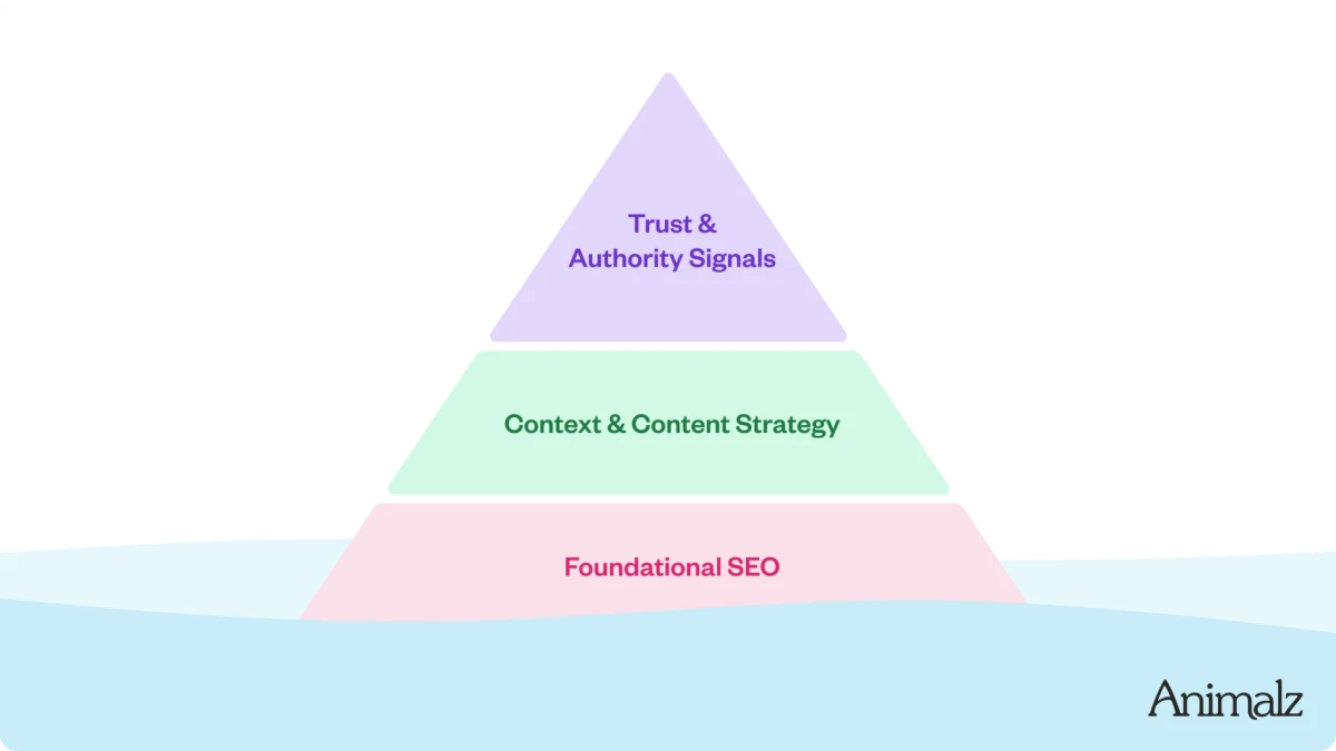 What it is: The AI Visibility Pyramid is a framework for optimizing content to appear in AI-powered search results from tools like ChatGPT, Gemini, and Google’s AI Overviews. It builds on traditional SEO fundamentals but adds new layers focused on how AI models select and cite sources when generating answers. The pyramid has three levels: SEO foundation (traditional optimization), AI-friendly content (citation-worthy assets), and credibility amplification (third-party mentions and reviews).