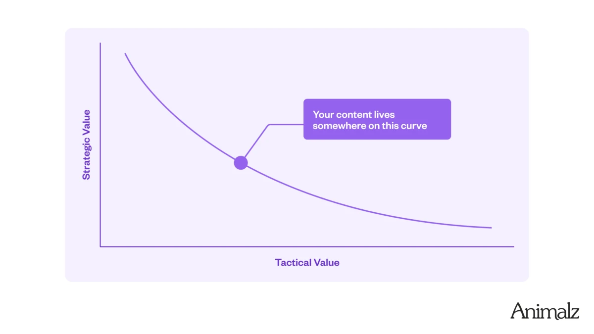 What it is: The Content Value Curve is a framework that maps the inverse relationship between tactical and strategic content value. It shows that content can help readers “do something” (tactical) or “think something” (strategic), but rarely both effectively — the more tactical value you add, the less strategic value you can provide, and vice versa. The framework helps you choose which type of value to prioritize based on your audience and goals.