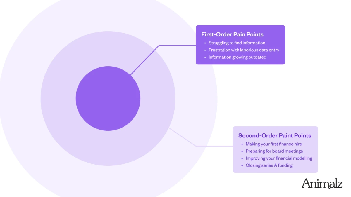 What it is: Second-order pain points are problems that are comorbid with the problems your product solves —occurring at the same time for the same people but not directly solved by your product.