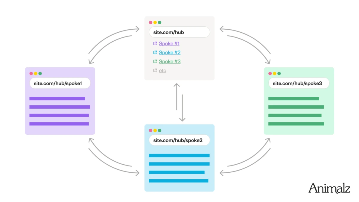 How it works: Think of the hub as a comprehensive table of contents, linking out to each spoke, with each spoke also linking back to the hub and to one another. This interconnected structure helps readers easily navigate related content, extends read time, and signals strong topical authority to search engines.