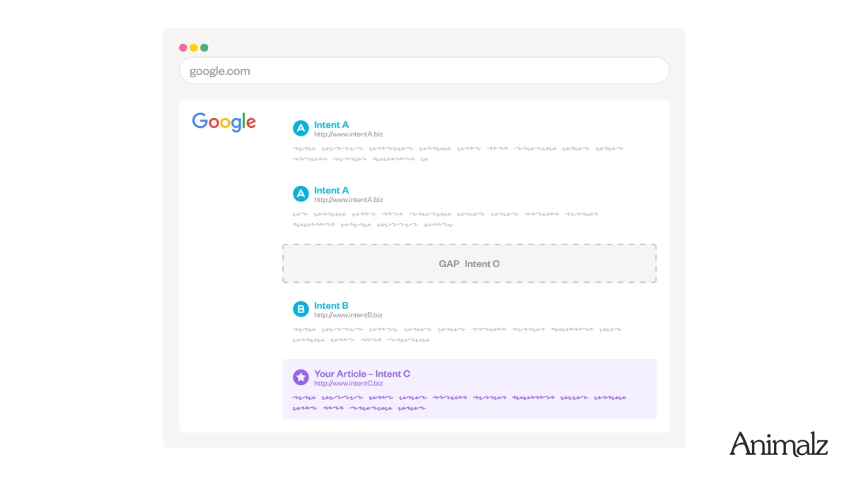 What they are: Intent gaps are missing search intents or unaddressed questions within existing search results that represent opportunities to rank for competitive keywords. The concept challenges the “Google knows best” fallacy— the assumption that current search results represent perfect content when they could be just the best of a bad bunch. Intent gaps occur because many keywords harbor dozens of different search intents, but Google can only surface a limited number of results that typically focus on one dominant angle.