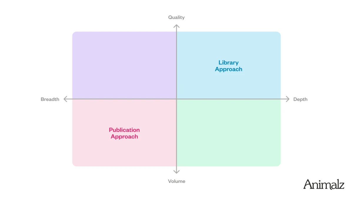 In the first iteration of this framework, we recommended the library approach for almost everyone, but the content landscape has shifted. SEO reliance has become riskier as algorithms changed and AI increasingly takes over. Today, we believe there’s immense potential in audience-building through other channels like newsletters and social media.