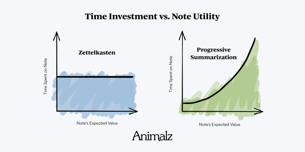 Zettelkasten and Progressive Summarization diverge on when and how much time to spend on your notes.