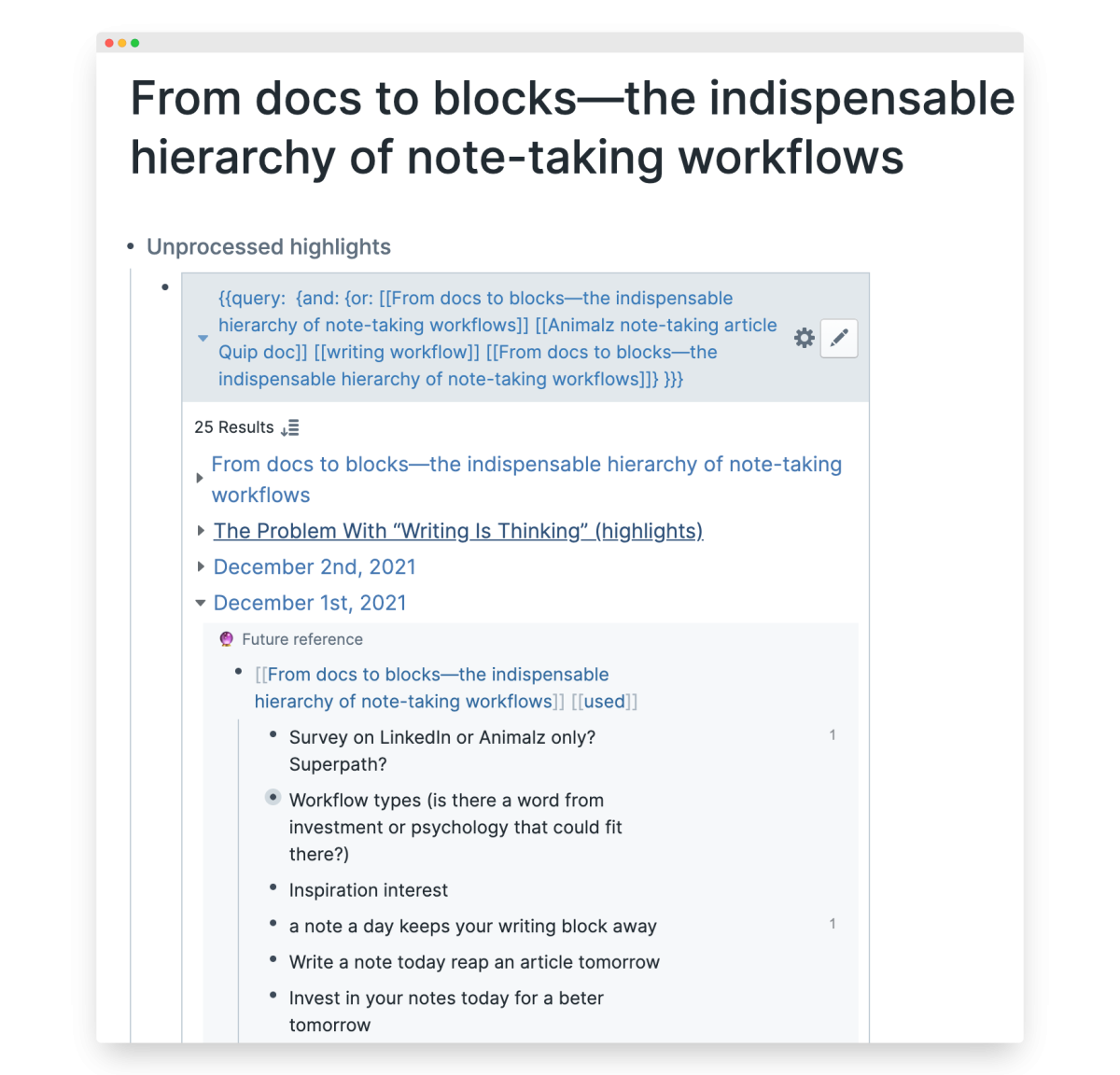 Notion’s API, for example, lets you pull in input from a form to a note, say from a research survey. And as the image below shows, with certain tools—like Roam Research—you can add a query at the top of a note that surfaces other notes (or blocks) that meet specific conditions. All your unprocessed reading highlights, for example, on the topic you’re currently writing about.
