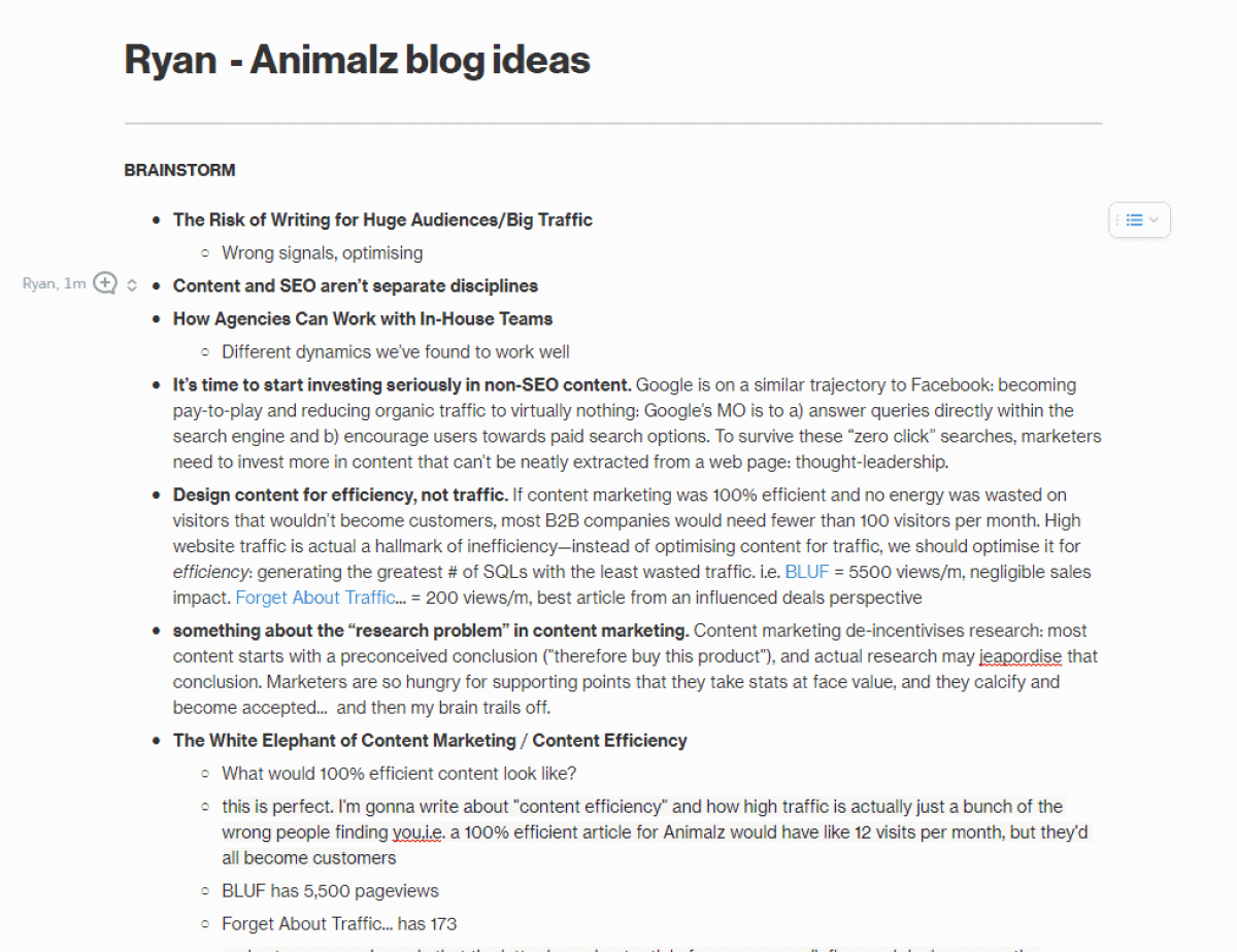 This is where the “farm” concept comes in: ideas are treated like seeds. They’re planted, nurtured, and allowed to cross-pollinate. The idea farm takes a handful of scattered, inconsistent thoughts, and from those thoughts grow beautiful, fully-formed blog post ideas.I use an idea farm for the Animalz blog. At the time of writing, it has over one hundred ideas, most of which will end up on the scrap heap. But these article ideas aren’t wasted energy: this scrap heap is the perfect environment for better ideas to grow.