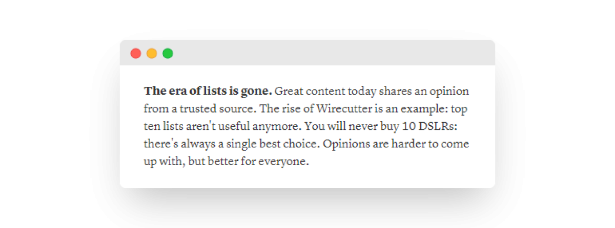 Here are a few examples from my own idea farm. This was the “seed” for the article that became Why Wirecutter Wins: Opinionated Content: