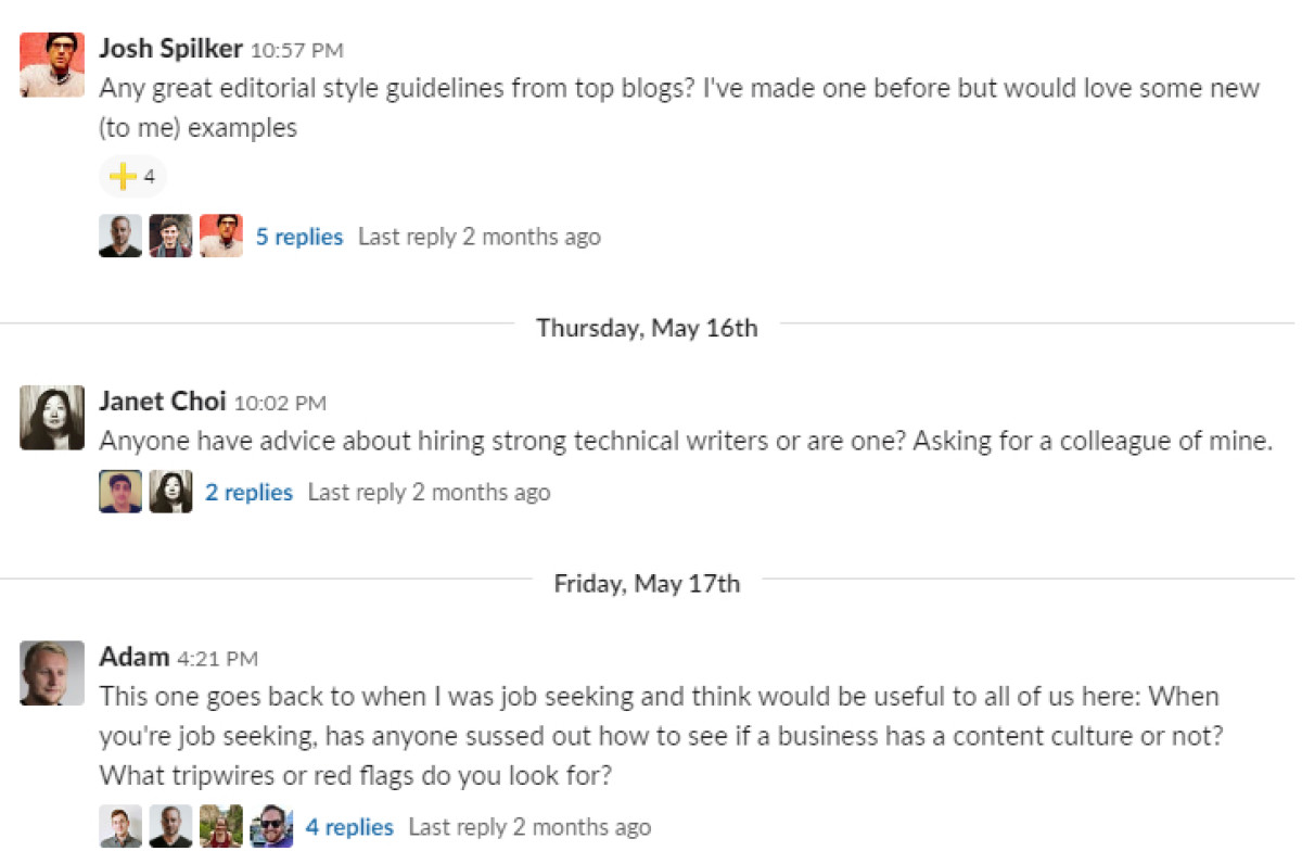 Niche communities. Find the Slack groups and forums your audience visits, and start engaging. Ask questions, analyze the types of content they share, and feed their ideas back into your keyword research (for content marketing topics, I love Jimmy’s Slack group, pictured below).
