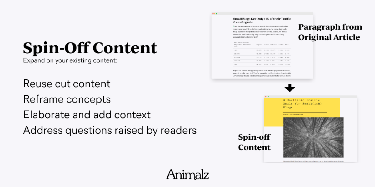 Many blogs have big landmark pieces of content, like ultimate guides, white papers, or research reports. Key findings and sections from this content can be spun-off into stand-alone content, creating a series of articles that widens the reach and distribution for the landmark content.Spin-off articles aren’t just a chance to rehash the same information; they provide crucial opportunities to: