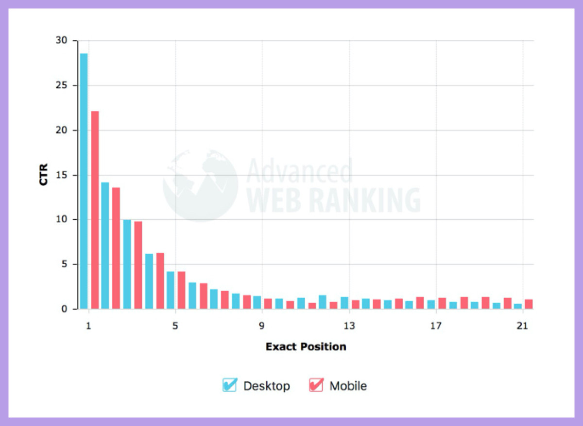 In a study of more than 1.6 million keywords, Advanced Web Rankingfound that the first search result on a Google SERP was clicked 28% of the time. That’s more than double the pages that ranked second and nearly seven times more than the fifth result. More often than not, “if you ain’t first, you’re last.”
