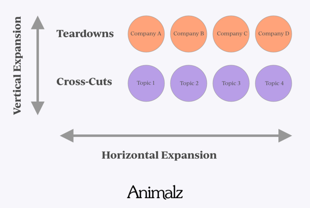 When you use templates, you create a content series that dives deep into specific topics, people, or companies. Creating more teardowns is an example of horizontal expansion, i.e., you create more of the same thing.