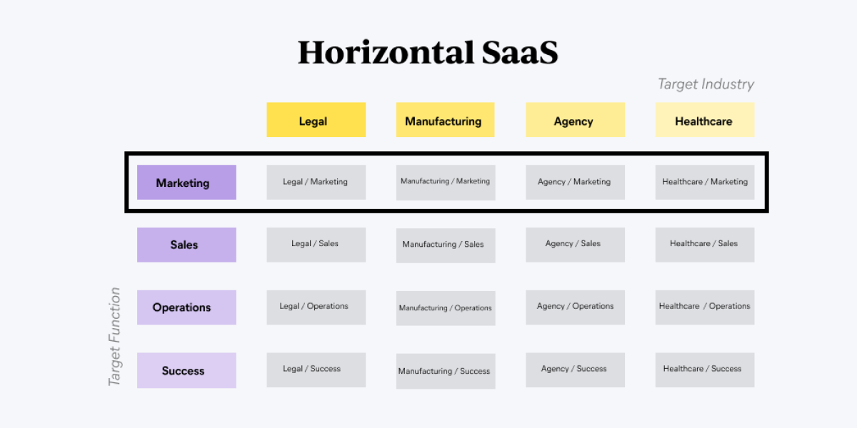 Many software companies are “horizontal SaaS”: products that help with specific business functions—like marketing or accounting—but remain agnostic to the industries that they serve. HubSpot focuses solely on marketing features but targets companies in all industries, from SMB through to the enterprise; QuickBooks does the same with accounting.