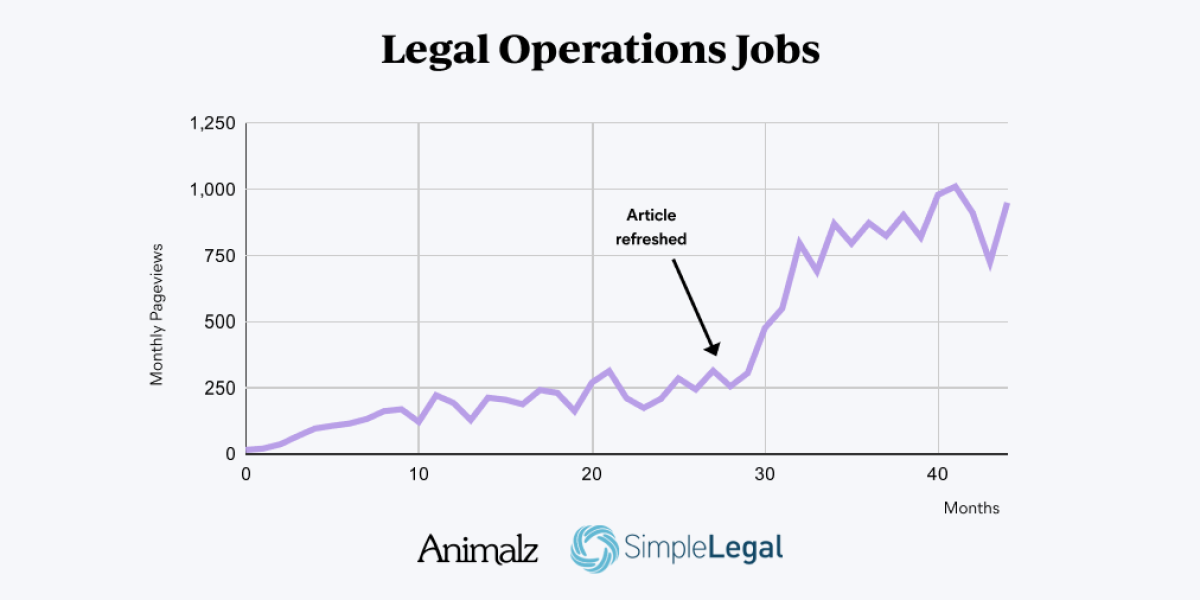 What is legal operations? was expanded from a simple definition article to include greater historical context and recent data—the evolution of the legal ops function over time, and research showing the number of legal ops professionals in the average legal team. These updates helped boost monthly pageviews from 256 to 1,013 post-refresh.