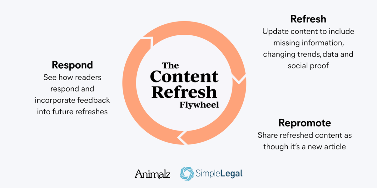Content refreshing is designed primarily to increase organic search traffic—but Kara and the SimpleLegal team go further, using newly updated articles to generate traffic and engagement from extra channels. Every updated article is put through a repromotion process, and as Kara explains, “it’s about the same as our new content [promotion] process.”